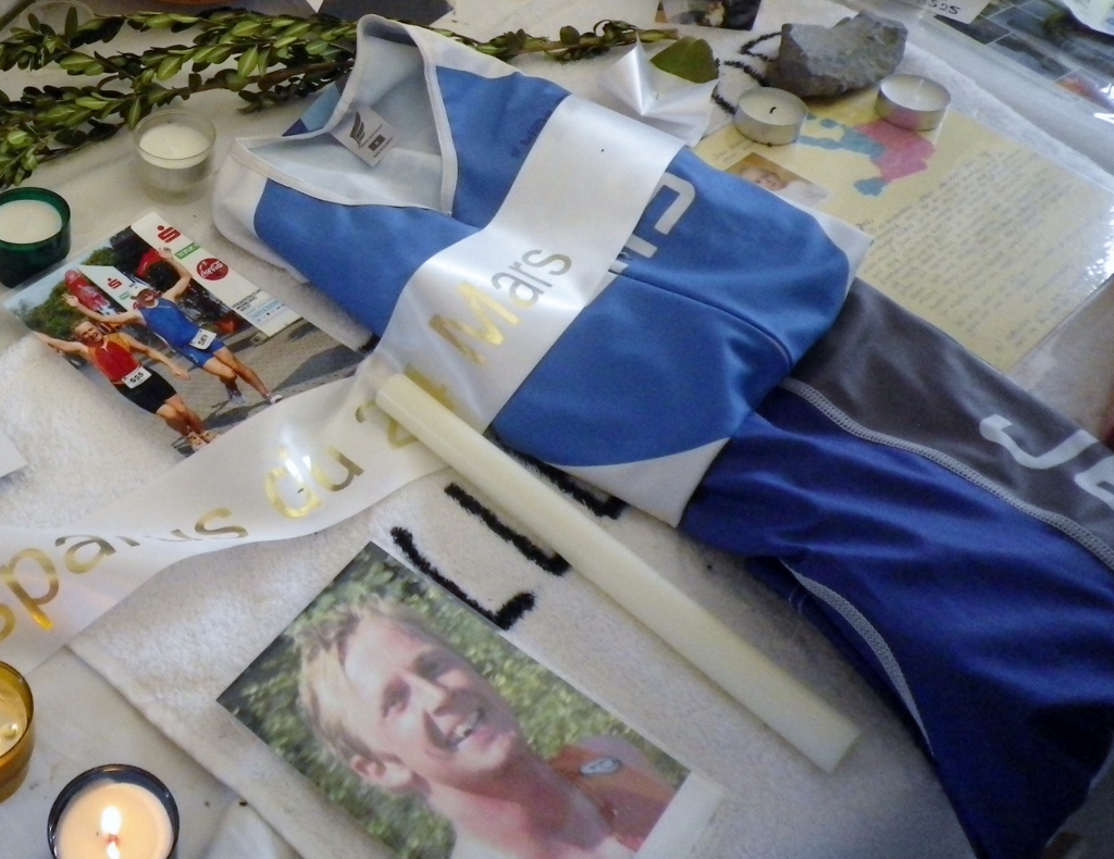 Wir wenden uns ab und betreten zum ersten Mal die Kapelle. Bei unserem letzten Besuch war die Zeit zu knapp. Sofort entdecke ich auf dem Tisch den Triathlonanzug von Jens und darunter ein weißes Handtuch, das die Aufschrift trägt »Wir alle für Jens«. Es ist mit den Vereinsinsignien bestickt . Beides stammt von den Triathlonfreunden aus Düsseldorf.