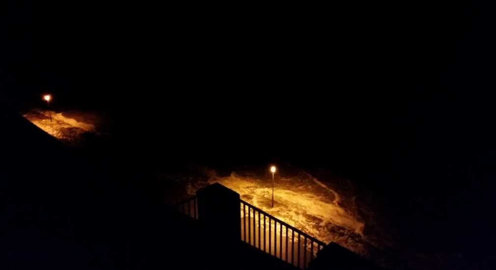 Obwohl ich nur mit einem Pyjama bekleidet bin, spielt die Kälte eine untergeordnete Rolle. Das, was ich sehe, beeindruckt. Seit einigen Tagen pfeift der Wind mit all seinen Tücken über die Insel hinweg. Die aufgewühlte Flut drängt das Meereswasser meterweit vor sich her, bis es schließlich die Promenade überschwemmt. Bereits das ist für (auf)geweckte Naturen, zu der ich im wahrsten Sinne des Wortes gehöre, ein Großereignis, welches die Dunkelheit belebt. Die Nacht ist gerettet. Die Uhr verkündet morgendliche 2.30 Uhr. Trotzdem entdecke ich zwei Personen, die das Ereignis mit ihren Fotoapparaten eifrig würdigen. Einer schraubt sogar an einem Stativ herum. Ich bin also nicht die Einzige, die zu so früher Stunde die Umgebung beobachtet. Ich schleiche zurück in das Zimmer, um das Smartphone zu holen. Mein Mann schläft tief.