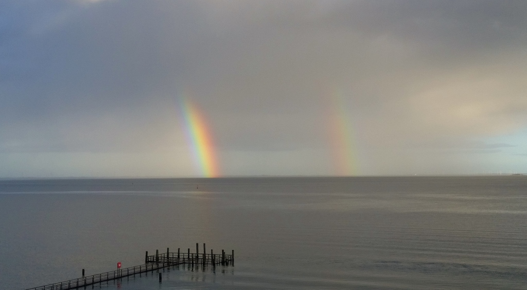 Am Nachmittag gehen wir am Strand und später auf dem Deich spazieren. Die Luft besticht durch ihre Klarheit, Wolken lassen das Himmelsblau durchleuchten. Wir sehen noch mehr Regenbögen.