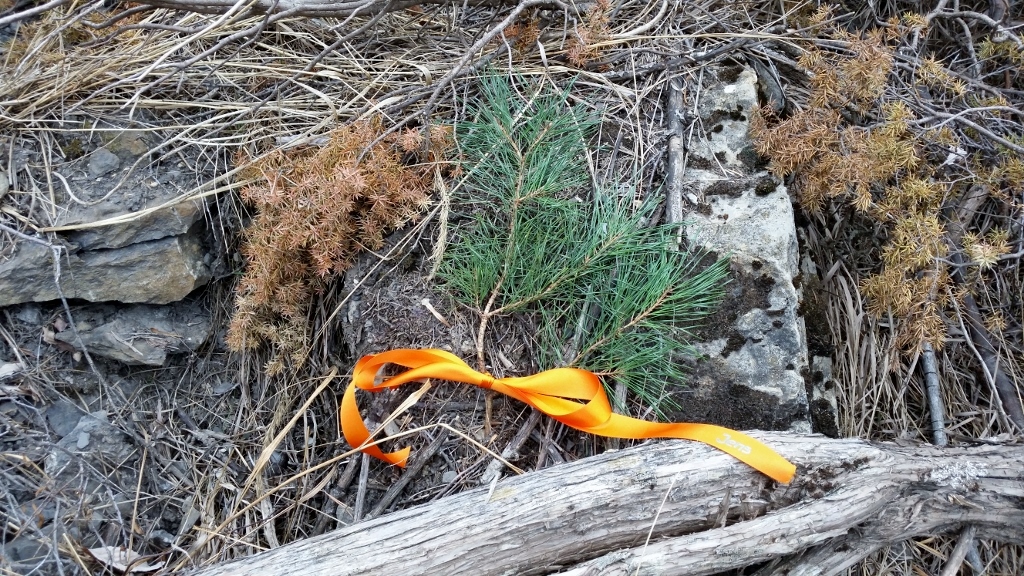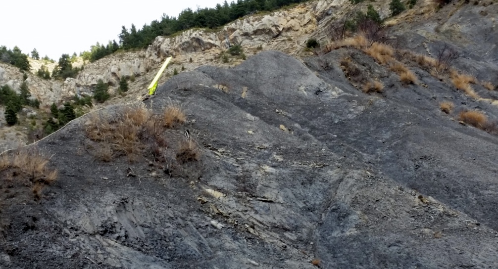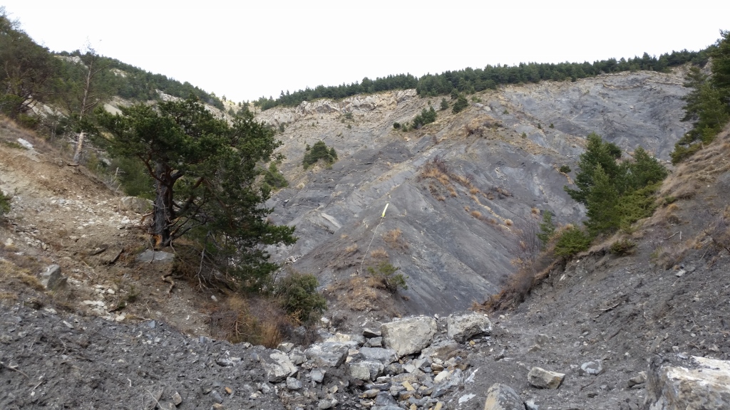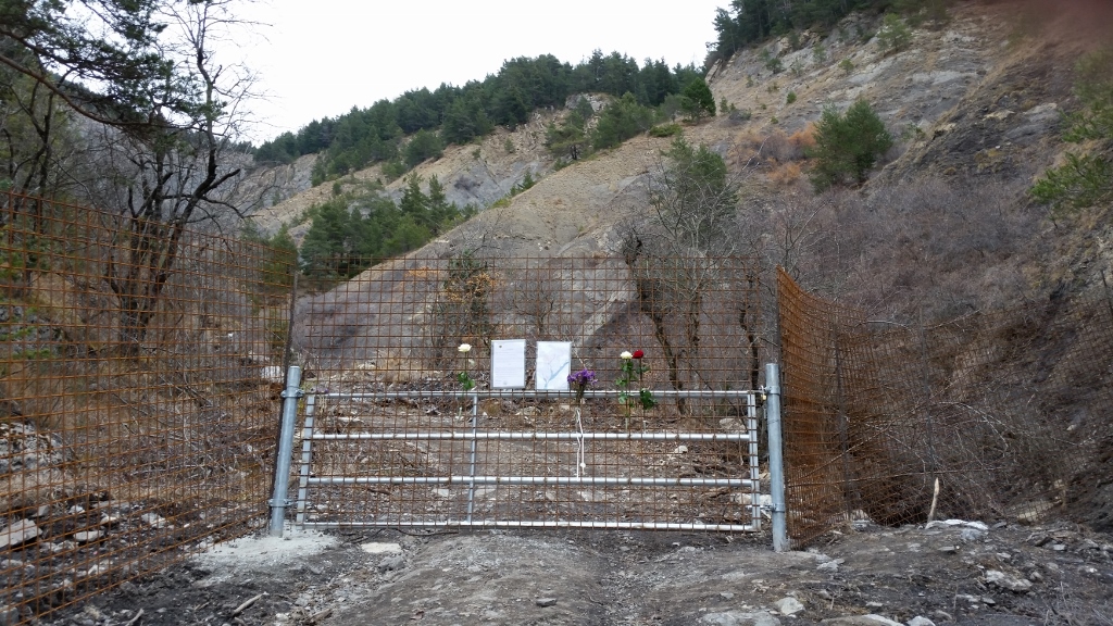 Gemeinsam bewältigen wir die Sperre. Neben uns türmen sich Felsen in die Höhe. Die Ausblicke auf den Ort des Crashs rücken näher. Wir erreichen die Stelle, an der Einwohner der Umgebung, ihnen voran die Bürgermeister von Le Vernet und Prads, ein großes Blumenbouquet in einer Kiste abgestellt haben (Link). Beides ist noch vorhanden. Natürlich sind die Blumen vertrocknet, tot.