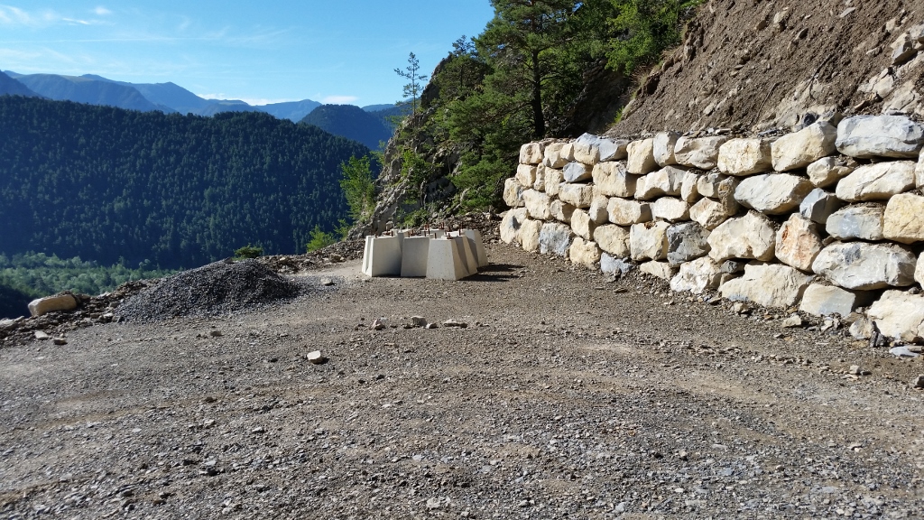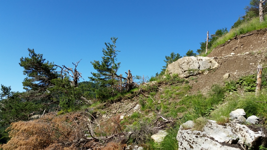 Die Sonne erhitzt zunehmend die Luft, allerdings ist es aushaltbar, weil wir luftig gekleidet sind. Nach dem Abstieg vom Sattel geht es erneut bergauf, bis wir die letzte Absperrung erreichen. Sie schmiegt sich an die seitlichen Felsen und