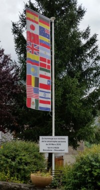 An der Hauptstraße erinnert eine Gedenktafel an den Flugzeugabsturz. An dem hohen Mast weht eine Fahne, auf der die Flaggen der Opfernationalitäten zusammengefasst sind.