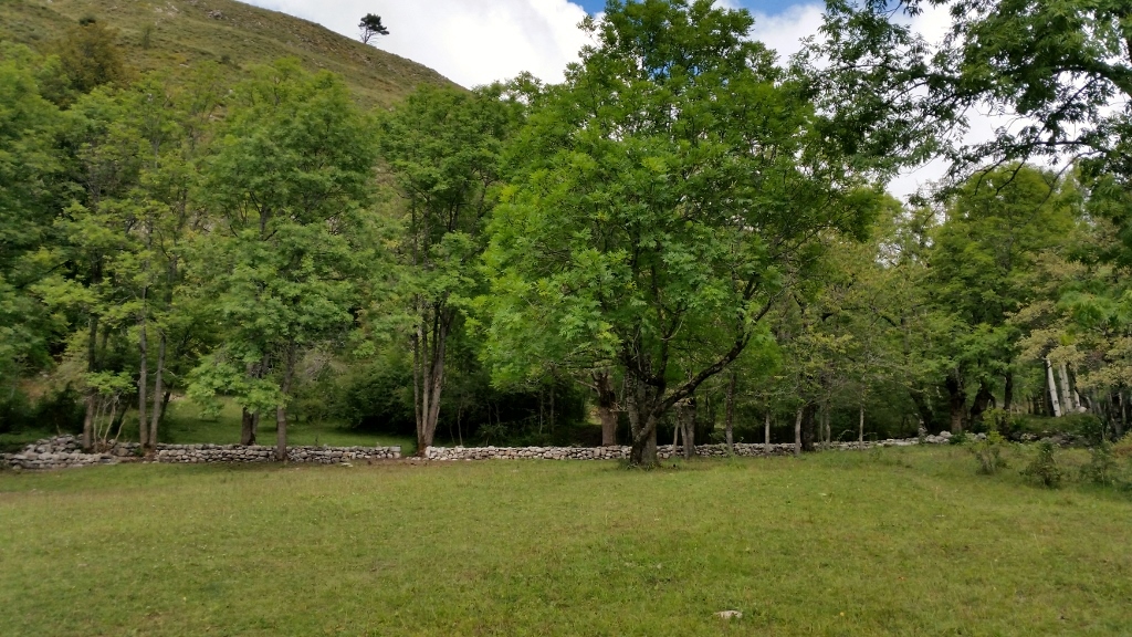 Auch wir brechen auf und erreichen nach einem Abstieg in 1368 m Höhe Pié Fourcha, dass sich etwa 1½ km von der Absturzstelle befindet. Den Ort mit den verbliebenen Steinmauern haben wir bereits mit Manfred und Heide vor einigen Tagen von Le Vernet aus erwandert. Er wurde einst von den Einwohnern verlassen, weil die Infrastruktur nicht stimmte. Es gab weder Strom noch eine Anbindung an das Straßennetz. Die Häuser verfielen und die Umgebung verwilderte.