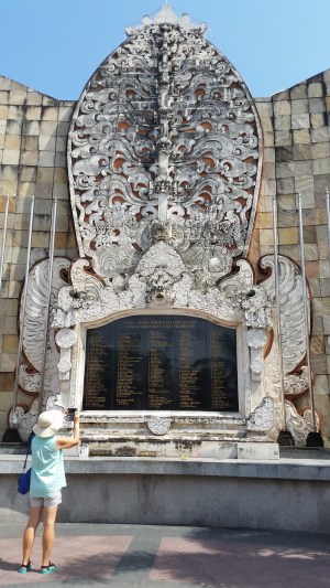Das Ziel ist Kuta, ein ehemaliges Fischerdorf, das sich zu einem hektischen Urlauberparadies entwickelt hat. Dort treffen wir uns mit den australischen Freunden auf einem unbefestigten Parkplatz, auf dem teilweise das Grün sprießt. Wir umarmen uns freudig, unterhalten uns rege, während wir die Fahrbahn queren. Auf der gegenüberliegenden Seite stehen wir plötzlich vor einem riesigen Monument.