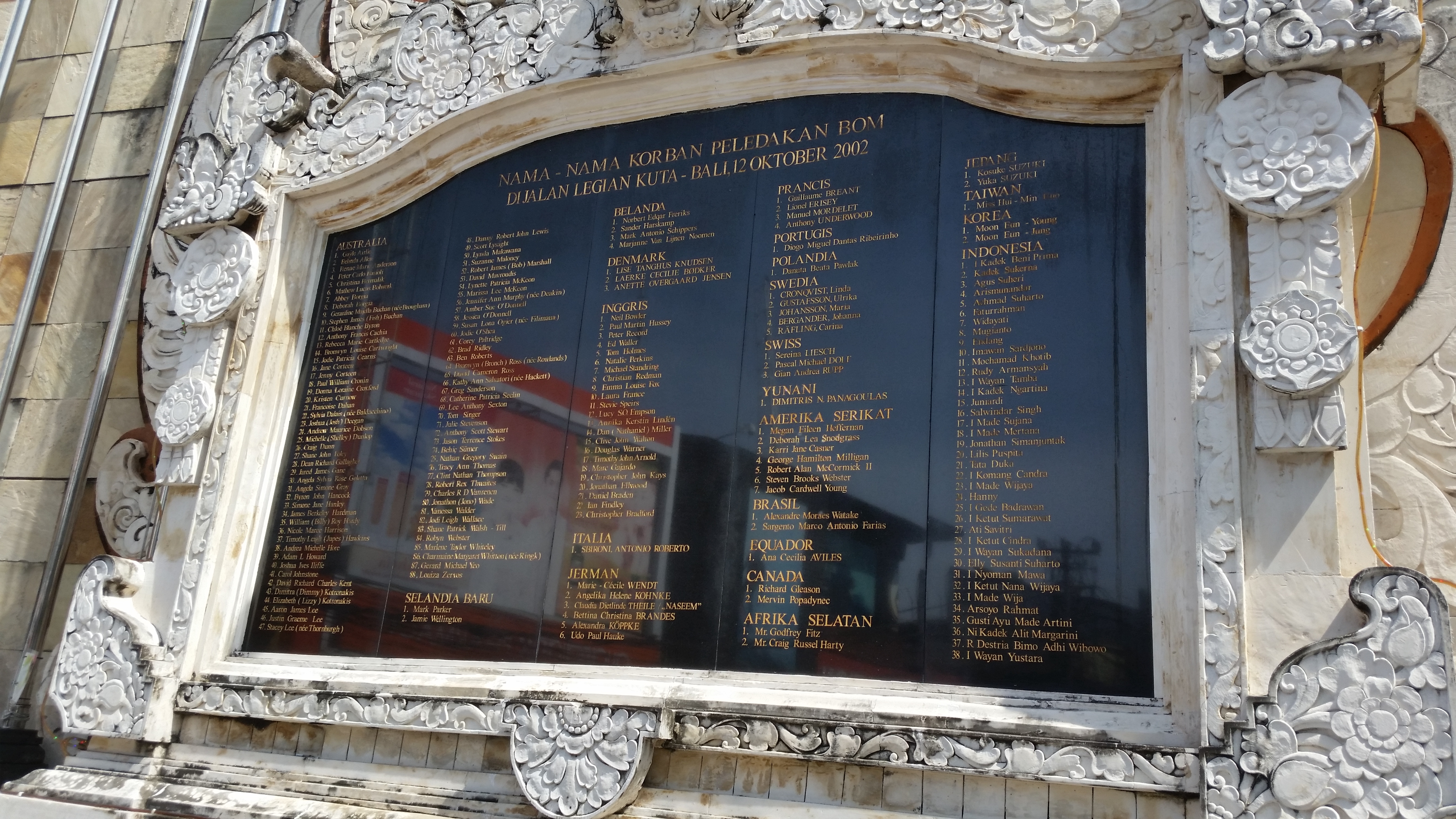 Auf der schwarzen Marmorwand lese ich die Namen der Opfer sowie die dazugehörigen Nationalitäten. Umrahmt wird sie von einem Bogen, wie man ihn in hinduistischen Tempelanlagen finden kann.