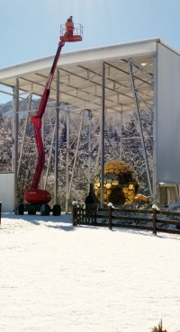 Bevor wir abfahren, stapfen wir zur Stele, wo die Abbauarbeiten der Zelte und des Denkmals begonnen haben. Die Kugel wird in Segmente zerlegt, um sie mit einem Sattelschlepper in einen benachbarten Ort zur Zwischenlagerung zu transportieren. Sobald es die Witterung zulässt, wird sie an der Absturzstelle wieder zusammengesetzt.