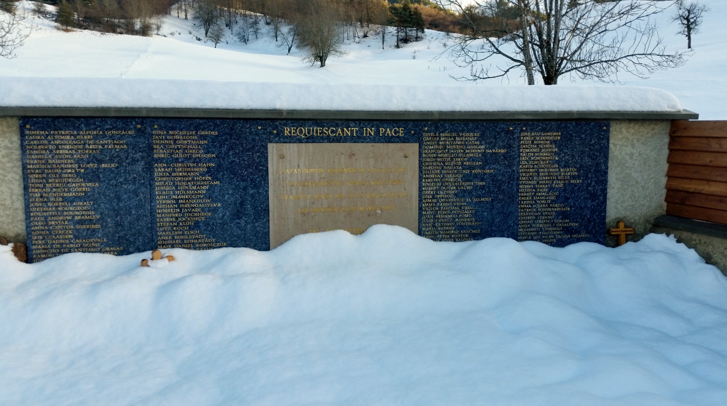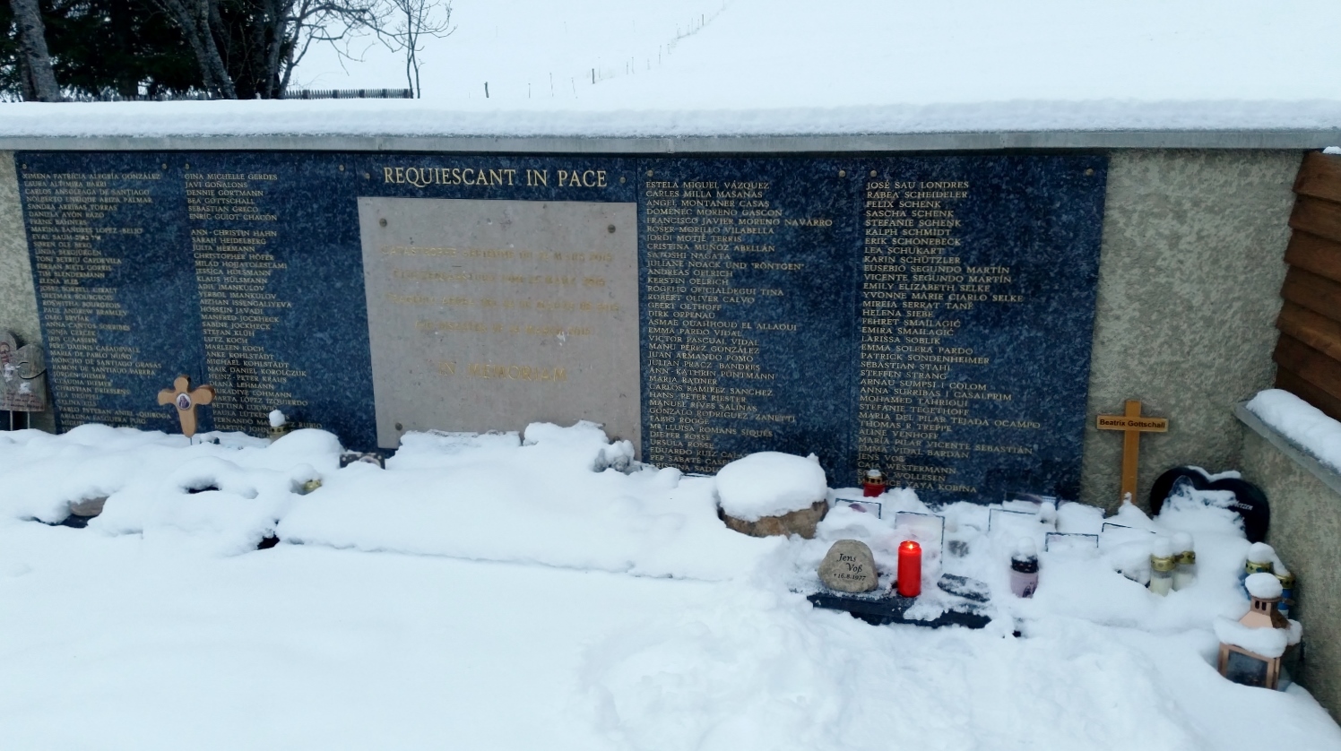 Hinter uns knirschen Schritte im Schnee. Die spanischen Eltern wollen ihren Sohn besuchen. Wir stehen vor dem Grab und radebrechen mit Händen und Füßen. Das Englisch des Vaters verstehe ich kaum. Trotzdem unterhalten wir uns, irgendwie funktioniert so etwas immer. Sie zeigen auf der Gedenktafel, die an der Friedhofsmauer befestigt ist, den Namenszug ihres Kindes – Jordi. Der von Jens ist vollkommen in einer Schneewand vergraben, da er im unteren Bereich der Platte zu finden ist. Ihr Sohn verlobte sich wenige Tage vor dem Flugzeugabsturz. Sie sind wie wir wütend, weil niemand die Verantwortung für die Katastrophe übernimmt und Lufthansa jegliche Schuld weit von sich weist. Auch sie fragen sich, wieso der Copilot überhaupt eine Passagiermaschine steuern durfte. Es war ein gutes, aber sehr trauriges Gespräch.
