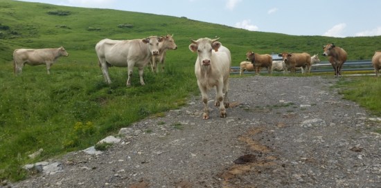 Der Weg verengt sich, und die Vegetation weicht einer Hochalm. Kühe kommen neugierig auf uns zu. Doch je mehr wir uns ihnen nähern, desto mehr weichen sie zurück. Ich rede beruhigend auf sie ein, denn in Konflikt möchte ich mit den kräftigen Tieren nicht geraten.