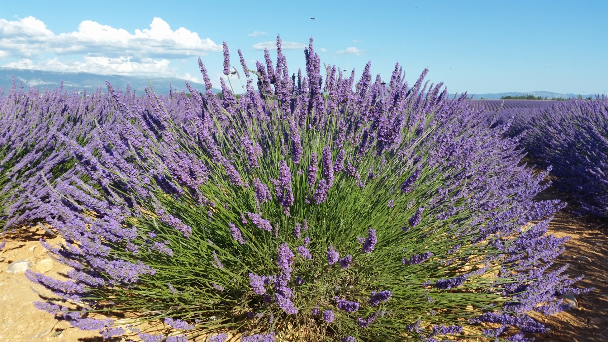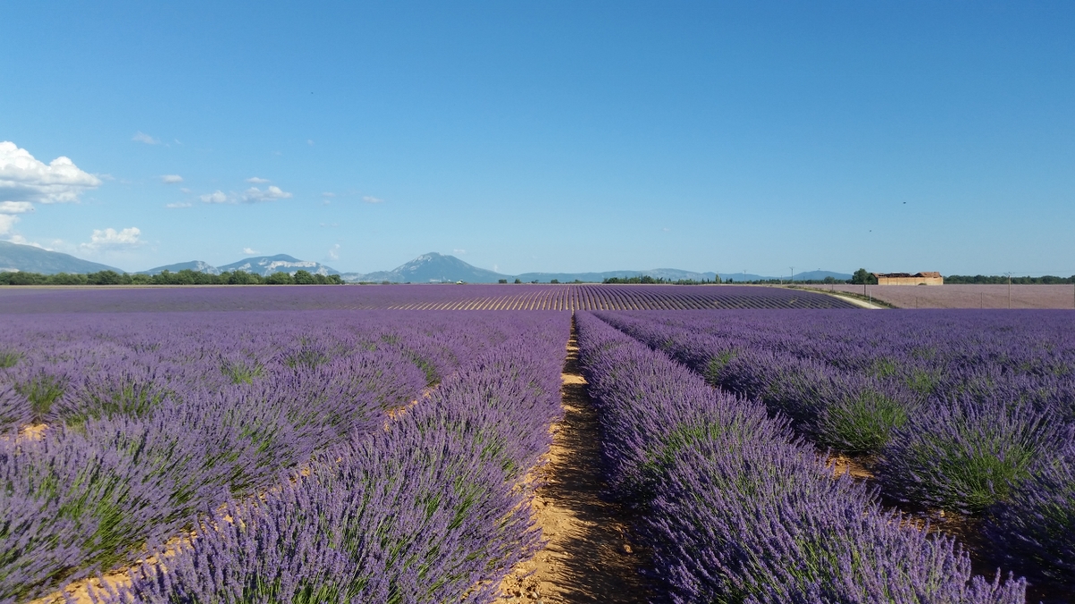 Die Lavendelbüschel sind in Reihe angeordnet. Sie ergeben violette Linien, die links und rechts genug Platz für die hellen Zwischenräume lassen. Daraus resultiert ein Streifenmuster, das in der weiten Ebene den Bergen zustrebt, die in der Ferne senkrecht in die Höhe ragen. Waagerechte Achse trifft auf vertikale. Zusammen mit Licht und Farben ergibt das eine bewunderungswürdige Geometrie …