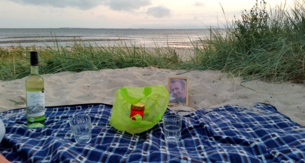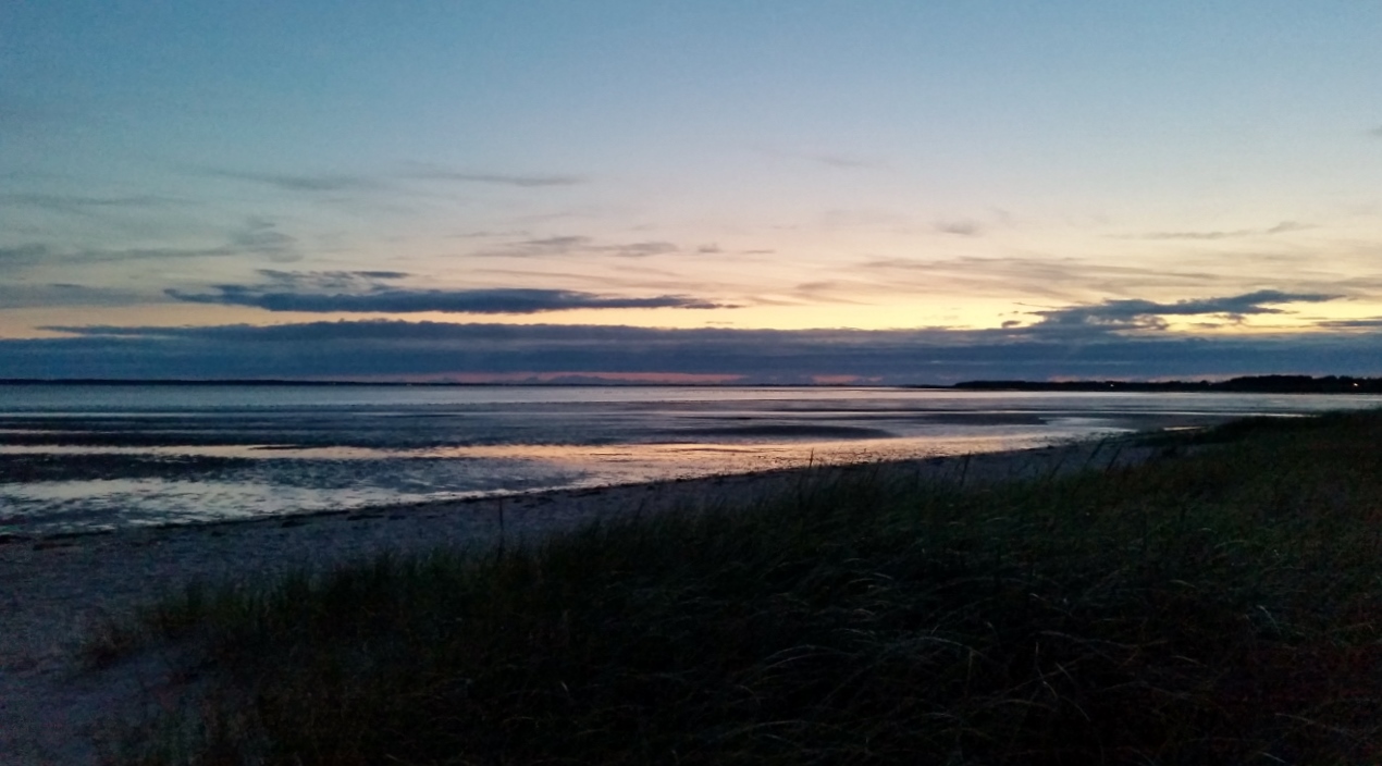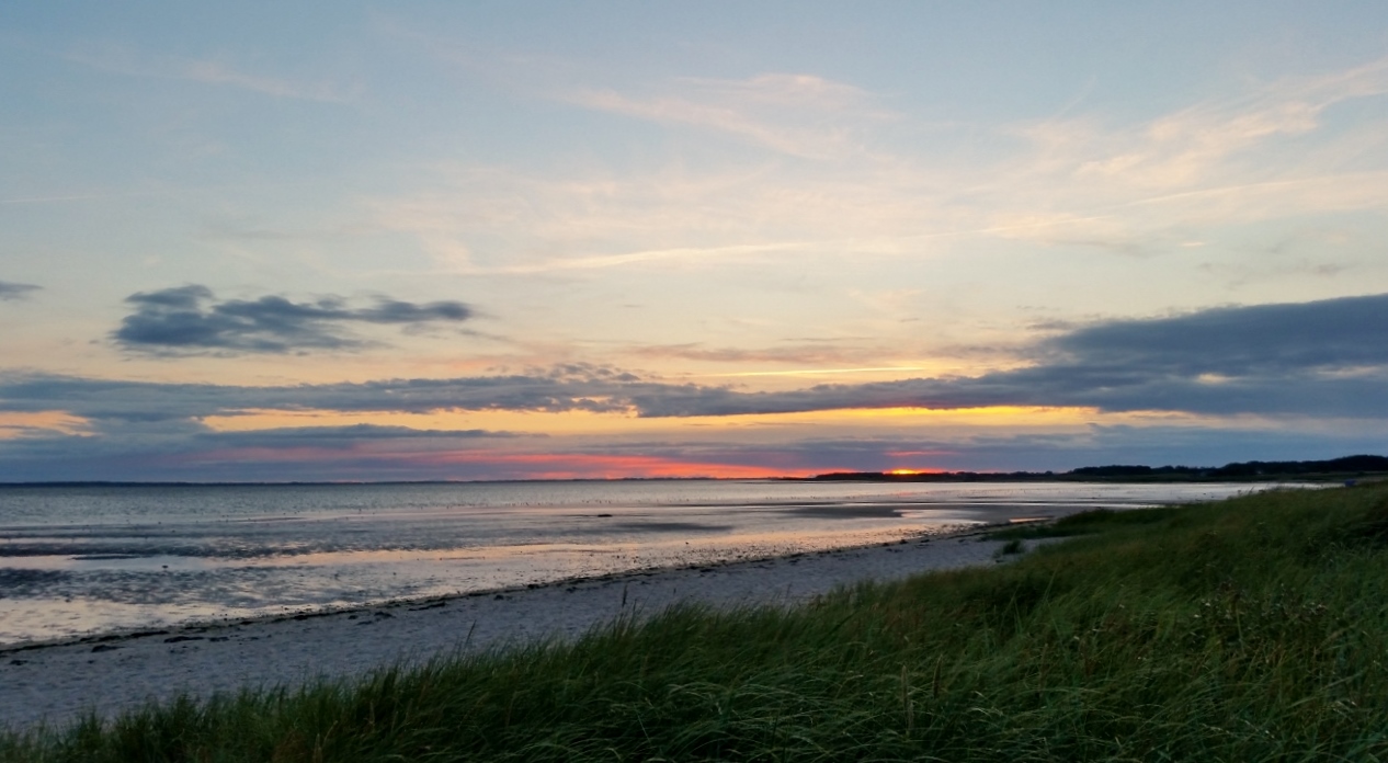 Nach dem Abendbrot fahren wir an einen Küstenstreifen in der Nähe von Nieblum. Am Dünenrand breiten wir eine Decke aus und stellen das Foto von Jens in den Sand. Gegenüber erkennen wir die Insel Amrum, die wir heute besucht haben.