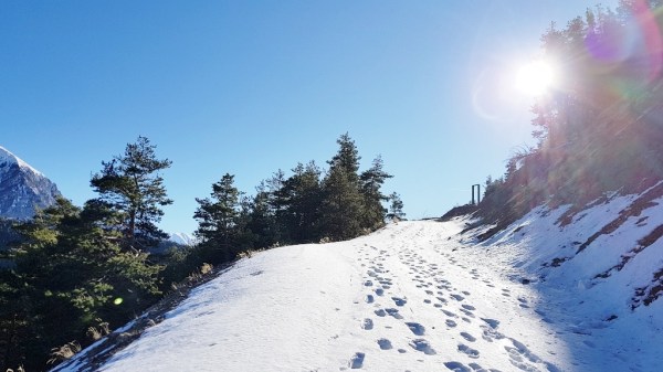 Am letzten Tag des Jahres wandern wir zum Ort des Flugzeugabsturzes. Teilweise sind die Wege schneefrei, manchmal stapfen wir durch den Schnee, und hin und wieder ist es extrem glatt. Die Absturzstelle selbst macht keinen winterlichen Eindruck.
