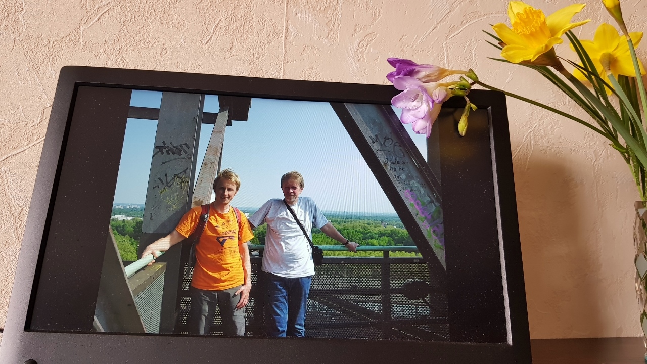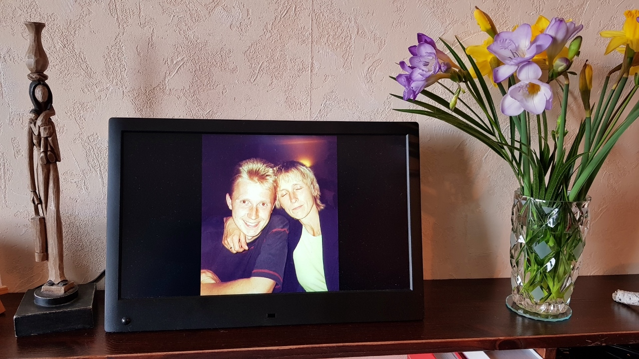 Wir haben uns einen elektronischen Bilderrahmen gekauft und anstelle des einen Bildes auf das Regal gestellt, das bisher dir gewidmet war. Wir besitzen eine Menge Fotos von dir, weil bei uns jeder fotografierte. Einige stammen aus deiner Kamera, oder Freunde haben sie dir gegeben.