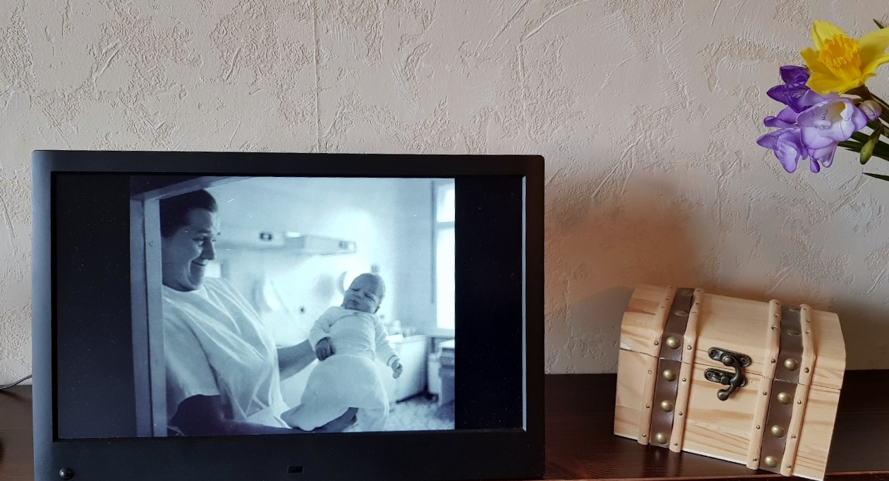 Manchmal stehe ich lange davor und betrachte aufmerksam die Bilder, die in nichtchronologischer Abfolge automatisch wechseln.