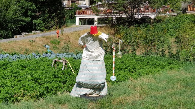 Wir gehen zurück zu unserer Unterkunft. Dabei queren wir eine Wiese, auf der sich ein kleines Gemüsefeld befindet. Eine Vogelscheuche vertreibt ungebetene, hungrige Gäste mit Schnabel. Sie besticht durch ihre Schönheit. J. J. hat seine Kreativität an ihr ausgelassen. Das angebaute Gemüse kommt direkt vom Feld in die Küche seines Restaurants.